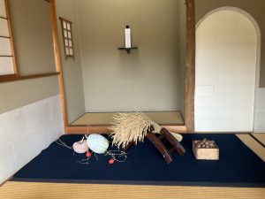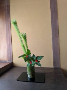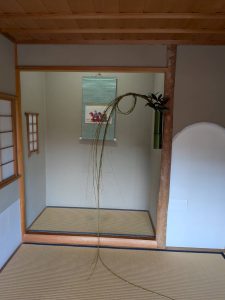 佐助邸の準備も調いましたよ。毎年、佐助さんのご子孫の方から青竹をいただき、床の間に正月のお花が生けられます。当時の佐助さんもこのように準備をしていたのでしょうね。和室の静寂さと相まって、ピンと背筋が伸びますね。嬉しい交流が今も続いています。貴重な伝統物や意匠が大切にして保存されていくことを願っています。