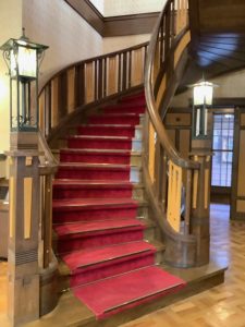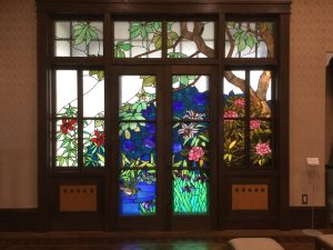 1階大広間には、正面に当時のステンドグラス(初夏)が目に飛び込んできます。今も煌々と輝きを見せ、大正時代へと誘ってくれることでしょう。そして、螺旋階段も優雅に颯爽と降りてくる貞奴さんを連想してみてはいかがでしょうか。実際にゆっくりと上り下りしてみるのも楽しいかもしれませんね。